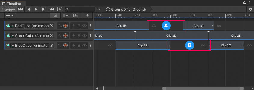 In the gap before the selected Animation clip, the GameObject bound to the Animation track repeats the entire animation forwards, then backwards. Use the Clip In property to offset the start of the loop. Changing the Clip In property affects the start of the loop when looping forward, and the end of the loop when looping backwards. |