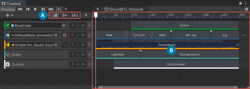 Use the Content view to add, position, and manage the clips and markers on each track in the Timeline asset or Timeline instance. The selected Edit mode determines how clips and markers interact with each other when you add, position, trim, resize, or delete them.