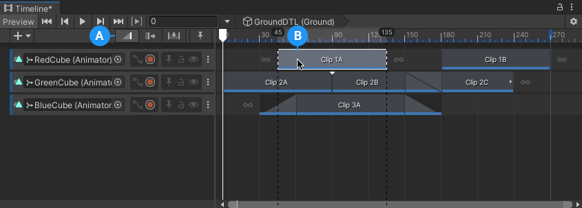 Select Mix mode (A). Select and drag to position a clip (B).
