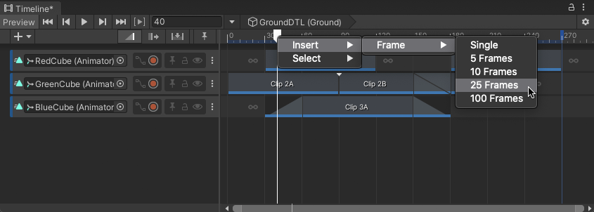 1. Right-click the Timeline Playhead on the Timeline ruler above the Content view, select Insert > Frame, and a number of frames.