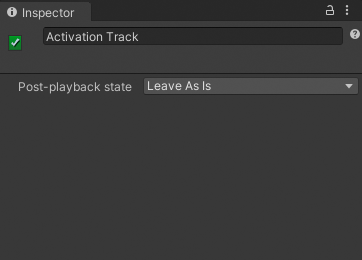 | Post-playback state | Sets the activation state for the bound GameObject when the Timeline asset stops playing. The Post-playback state applies to the Timeline asset and all of its Timeline instances. | |
