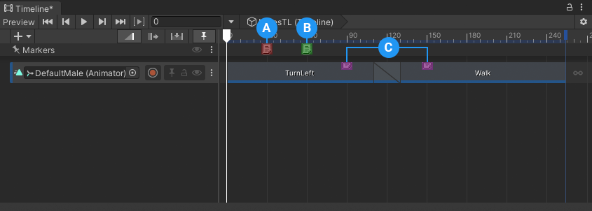 The examples in this workflow use the Timeline instance named NotesTL which has a single Animation track bound to the DefaultMale model. The content of this Animation track is the result of following the Animate a humanoid workflow.