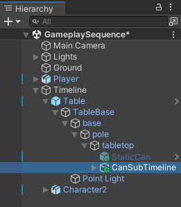 CanSubTimelineTimeline instance which is associated with theCanSubTimelineGameObject. This GameObject is within theTablehierarchy.The CanSubTimeline is associated with CanSubTimeline GameObject