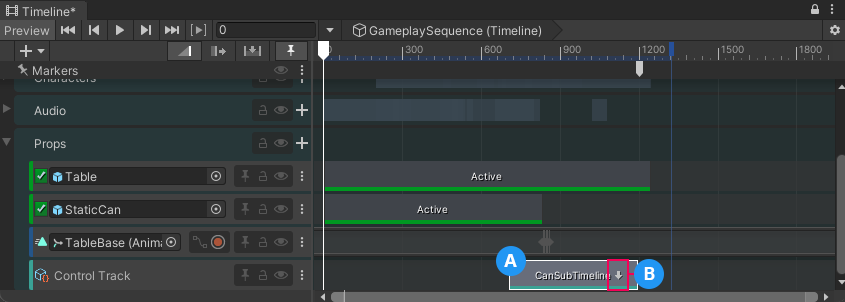 TableandCanGameObjects. The Props Track group also contains theCan Sub-TimelineControl track that nests theCanSubTimelineTimeline instance. This Timeline instance animates theCanGameObject as it bounces and falls off the table.