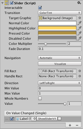 | Value | Current numeric value of the slider. If the value is set in the inspector it will be used as the initial value, but this will change at runtime when the value changes. |