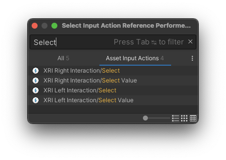 2. Find the specific action that you want to use for this component's input. The names in the default input action asset correspond to the type of interaction or locomotion controlled by each property. You can use the search field in the object picker dialog to narrow the choices shown in the list.