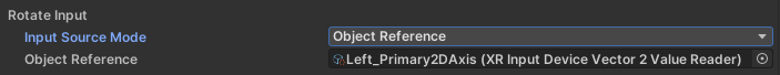 The Left_Primary2DAxis legacy input reader asset assigned to the Left Hand Turn Input property of a Continuous Turn Provider component