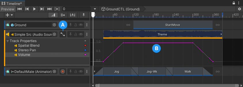 Each animatable property is calculated based on its keyframe values, the values for each Audio clip, the values for each Audio source, or a combination of each. Consult Audio track properties for more information on each animatable property.