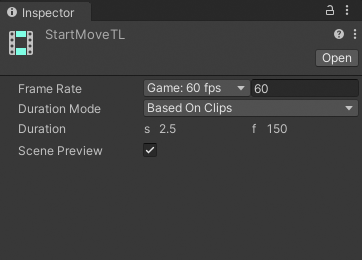 Use the Inspector window to set the frame rate, the duration mode, and a fixed length for the selected Timeline asset. Select a Timeline asset from the Project window to view its properties.