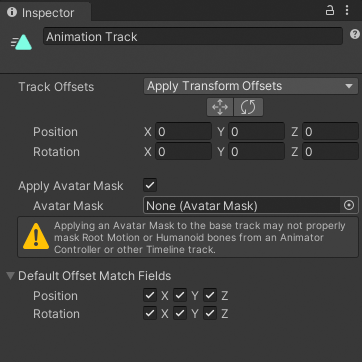 Use the Inspector window to change the name of an Animation track, set how track offsets are applied, use an avatar mask, and set which transforms are modified by default when you match clip offsets.