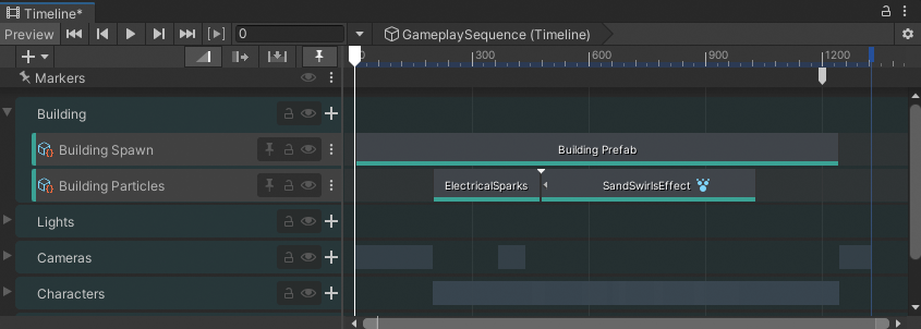 • Building Track group: Contains tracks for spawning the buildings and controlling particle effects related to the spawned buildings.