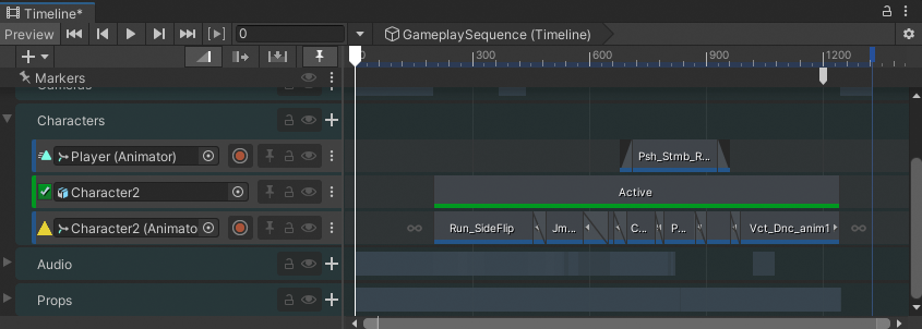 Character2 Animation track This track contains many Animation clips that blend together to create the parkour animation sequence for the Character2 character. This track also includes animation clips for the collision between characters and Character2 gesturing towards the main Player character.