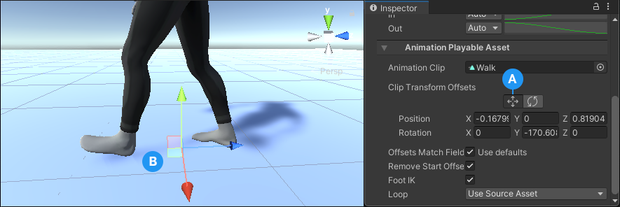 - In the Inspector window, under Clip Transform Offsets, enable the Move tool. The Move Gizmo appears in the Scene view at the root of the Animation clip. In the Scene view, drag the Move Gizmo.