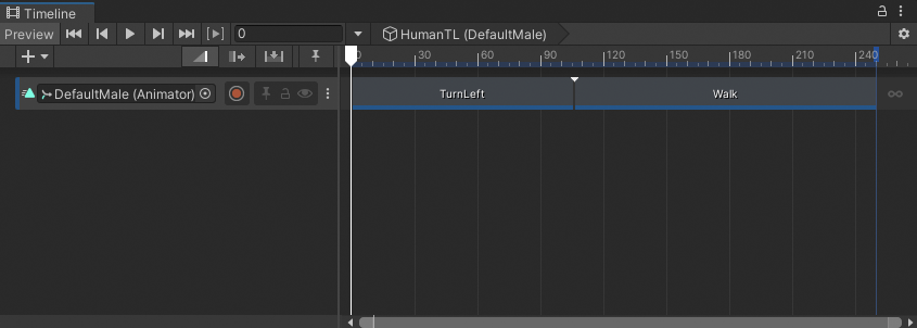 Play the Timeline instance again. Although the position and rotation of the humanoid matches, there is still a jump between the two Animation clips because the humanoid is in different poses: