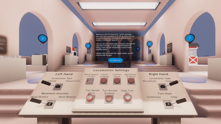 The example scene in this example project contains a Prefab based on the XR Origin with everything needed for input, 3D interaction, locomotion, and UI interaction with the toolkit. The scene also contains several stations that demonstrate different interaction setups.