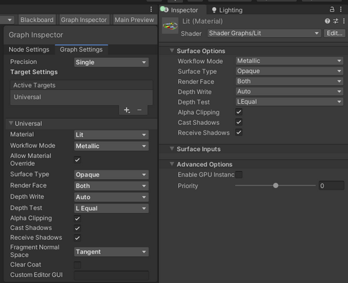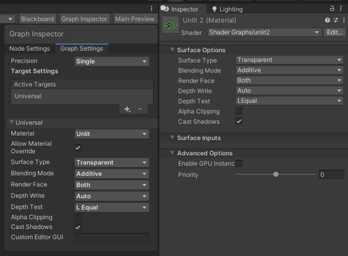 When you open a Shader Graph, the Graph Inspector displays the Graph Settings tab by default. Graph-wide settings for that specific Shader Graph appear in this tab.