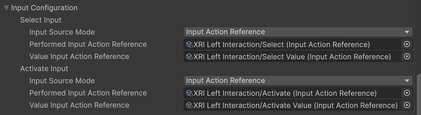 - Input Action: an Action that you set up and bind directly in an interactor's Inspector.